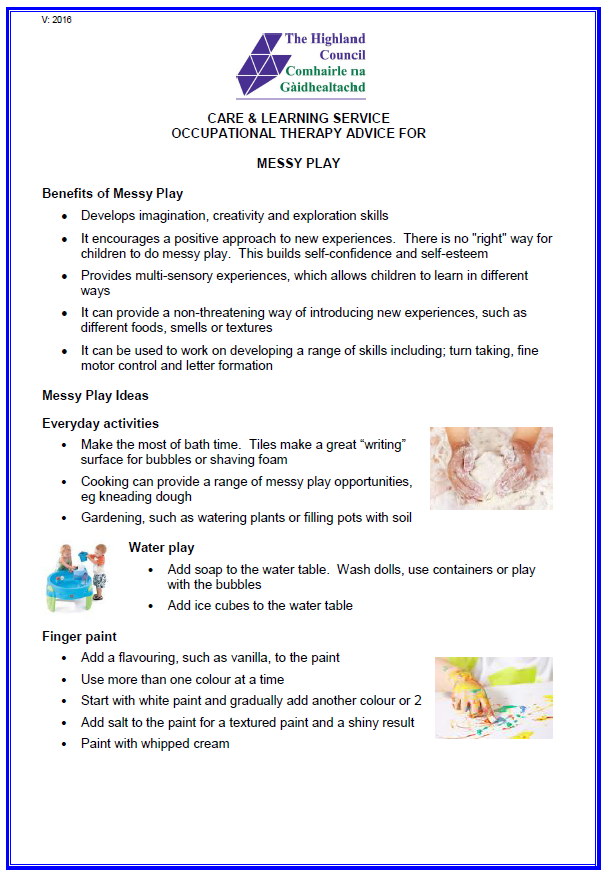 Access the Messy Play resource for sensory play experiences to support the development of fine motor skills and pre-writing skills.