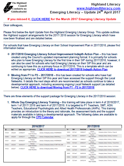 Please find below the April Update from the Highland Emerging Literacy Group. This update outlines the Highland support arrangements for the 2017/ 2018 session for Emerging Literacy which have now been finalised. The downloadable documents within the update can be downloaded on the links below: