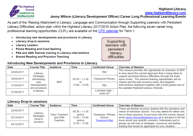 As shared before the summer break, Jenny Wilson, Literacy Development Officer (Highland Council) is developing Highland’s approach to Raising Attainment in Literacy, Language and Communication: Persistent Literacy Difficulties during the 2017/2018 session.
