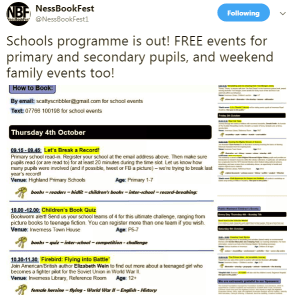 Ness Book Fest is back next month. Between Thursday 4th October and Sunday 7th October there are a number of book themed events for children, young people and adults advertised in this year’s programe.